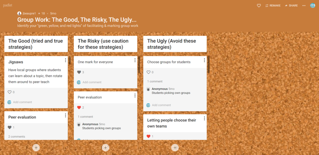 Padlet, a collaborative online bulletin board, can be a great complimentary to Zoom when you want people to brainstorm or organise their ideas as a group. Like Zoom, you just create your board and share the link with other participants without being registered. The participants can double-click anywhere on the board and post their notes with their names as well as attaching images or links to them.